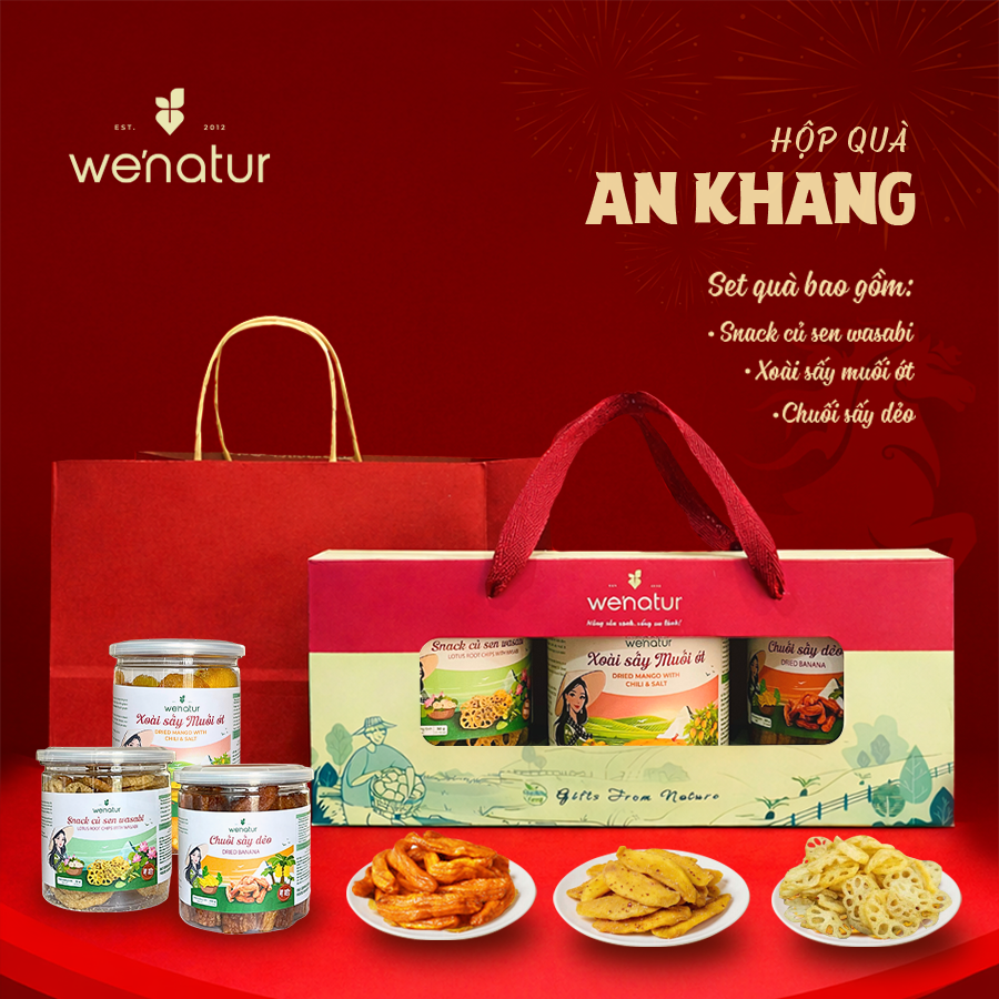 - Set An Khang gồm Chuối sấy dẻo ngọt nguyên chất we’natur 330g, Xoài sấy muối ớt 300g và Snack củ sen wasabi 50g. Sự kết hợp hài hòa giữa vị ngọt tự nhiên, chua cay nhẹ và độ giòn bùi, phù hợp làm quà biếu Tết cho nhiều đối tượng.